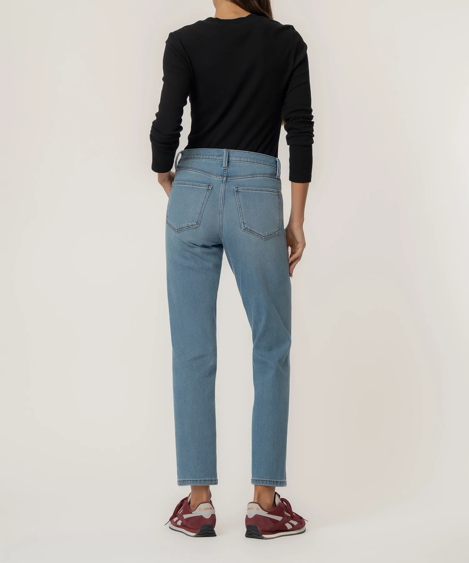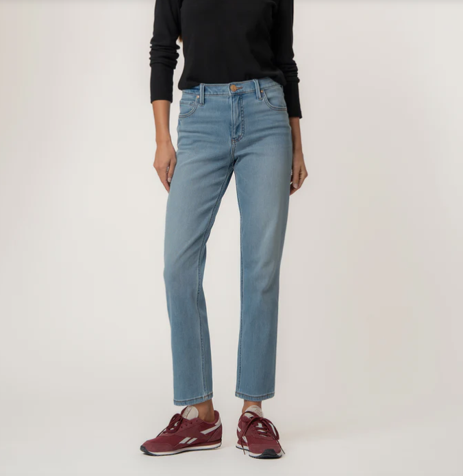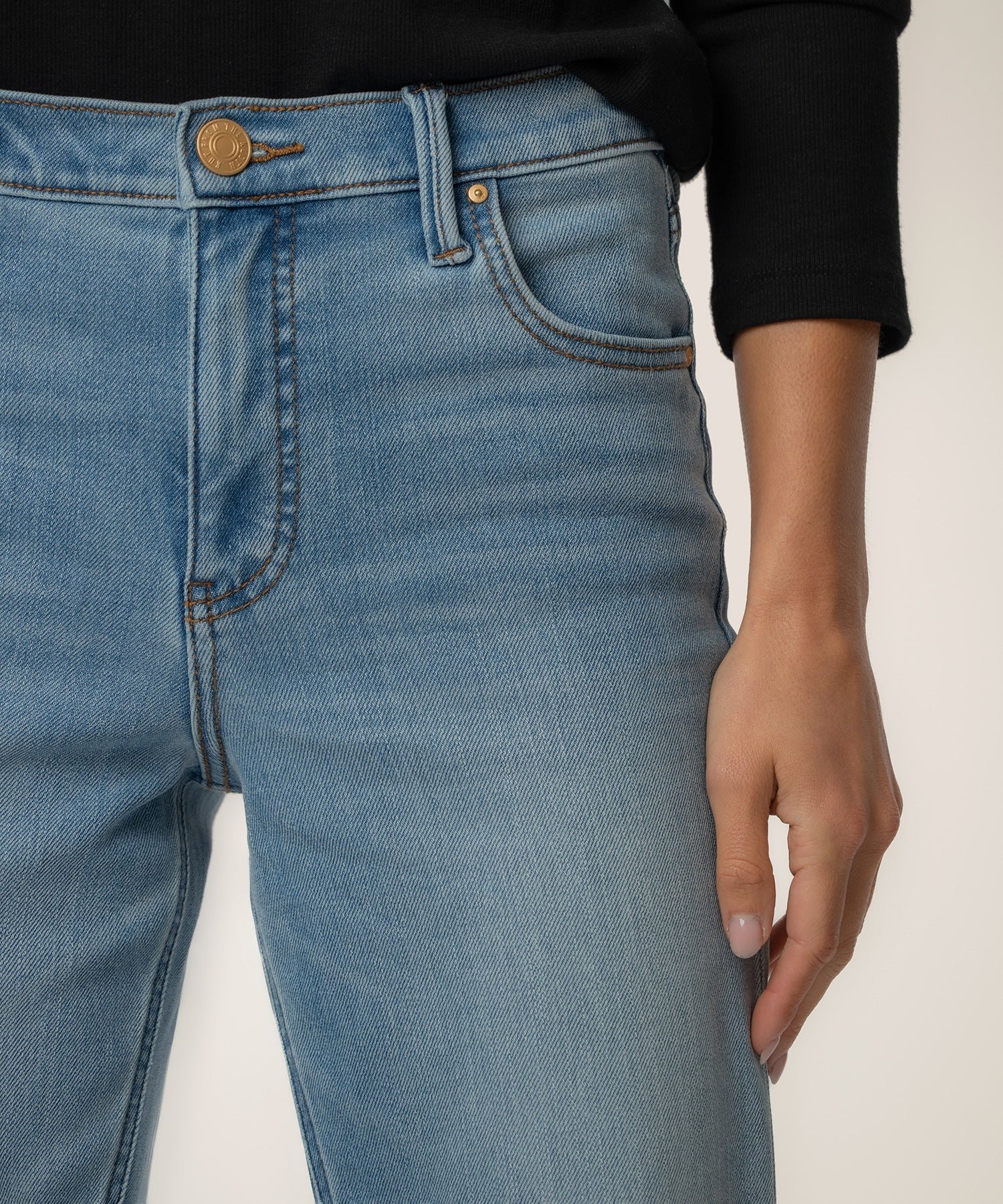 • These high-rise straight leg jeans blend style and comfort effortlessly, featuring flattering Fab Ab pockets that shape and smooth. The classic medium wash pairs perfectly with the timeless 5-pocket design, while the super stretchy fabric.