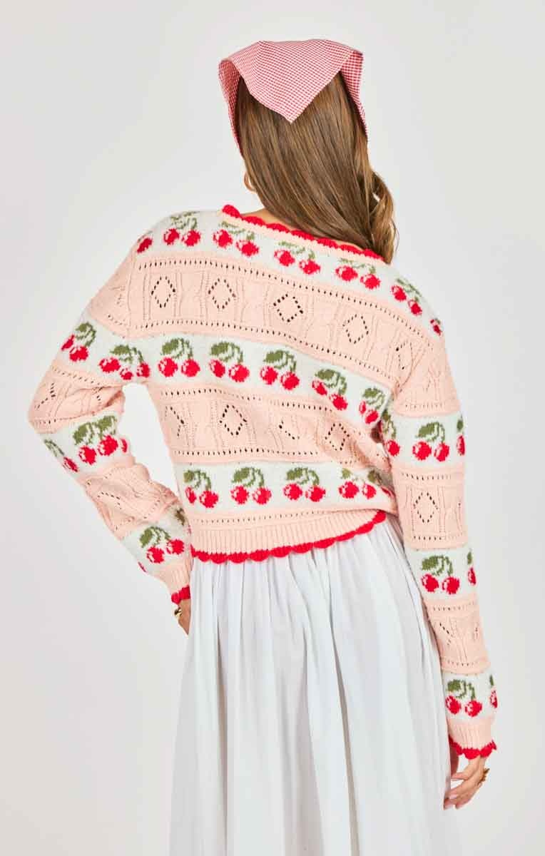 • This playful cherry knit sweater adds a fun, feminine touch to any outfit. Designed in a soft, lightweight pointelle knit, it features an allover cherry pattern with scalloped trim at the neckline, hem, and cuffs.