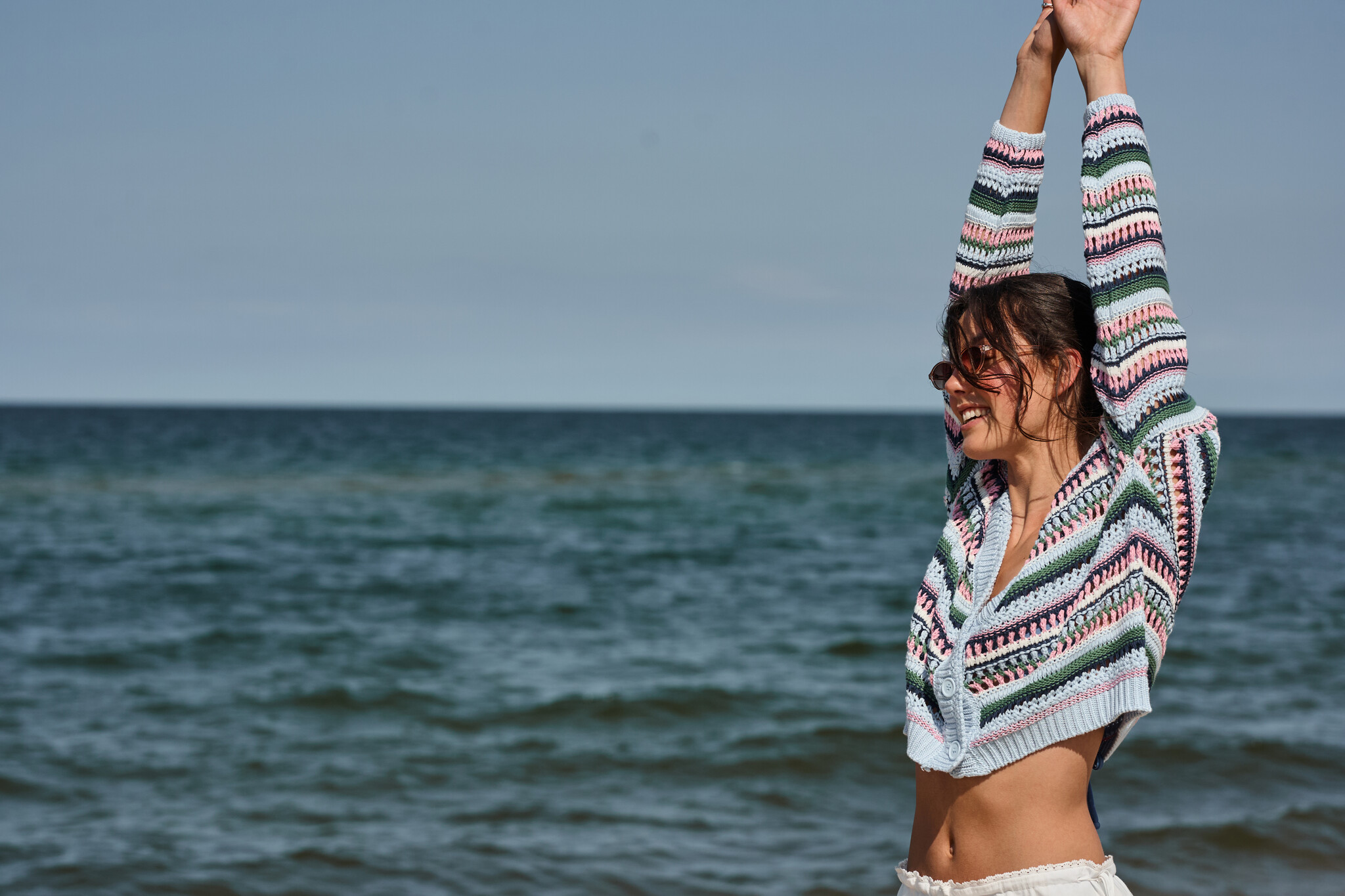 • A dreamy crochet cardigan with soft stripes that feels like a beach sunset you can wear. Lightweight, cozy, and effortlessly cute — the perfect throw-on layer for breezy days and cool nights.