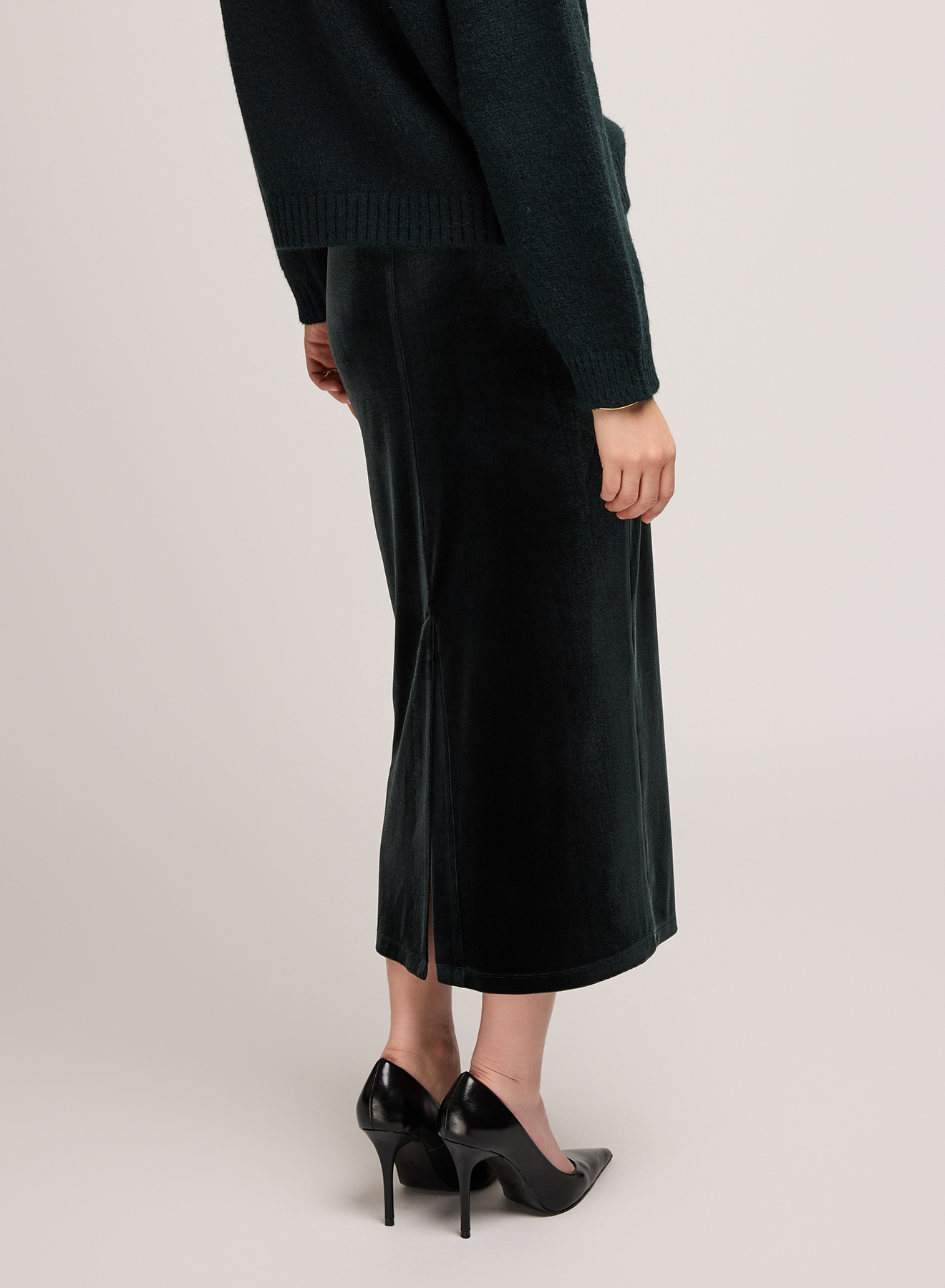 • This velvet midi skirt is a timeless wardrobe staple. Designed with a flattering mid-length and a subtle back slit for easy movement, it blends comfort with sophistication. The delicate scalloped elastic detail along the waistband adds a feminine touch.
