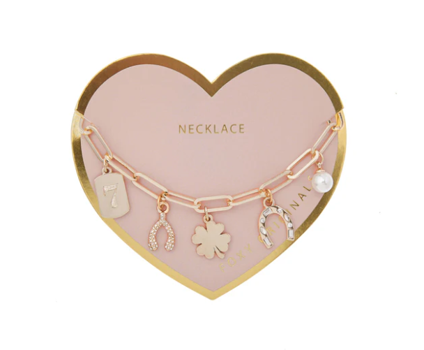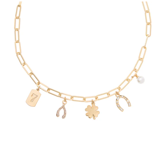 Elevate your look with the Lucky Charm Necklace. Featuring 5 beautiful charms: a shamrock, a pavet-studded wishbone, a pavet-studded horseshoe, a lucky number 7, and a delicate glass pearl. Available