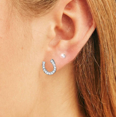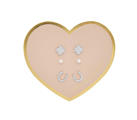 Curate the perfect ear stack with the Lucky Mix & Match Earrings. Featuring 3 pairs of stud earrings: shamrocks, glass pearls, and pavet-studded horseshoes.