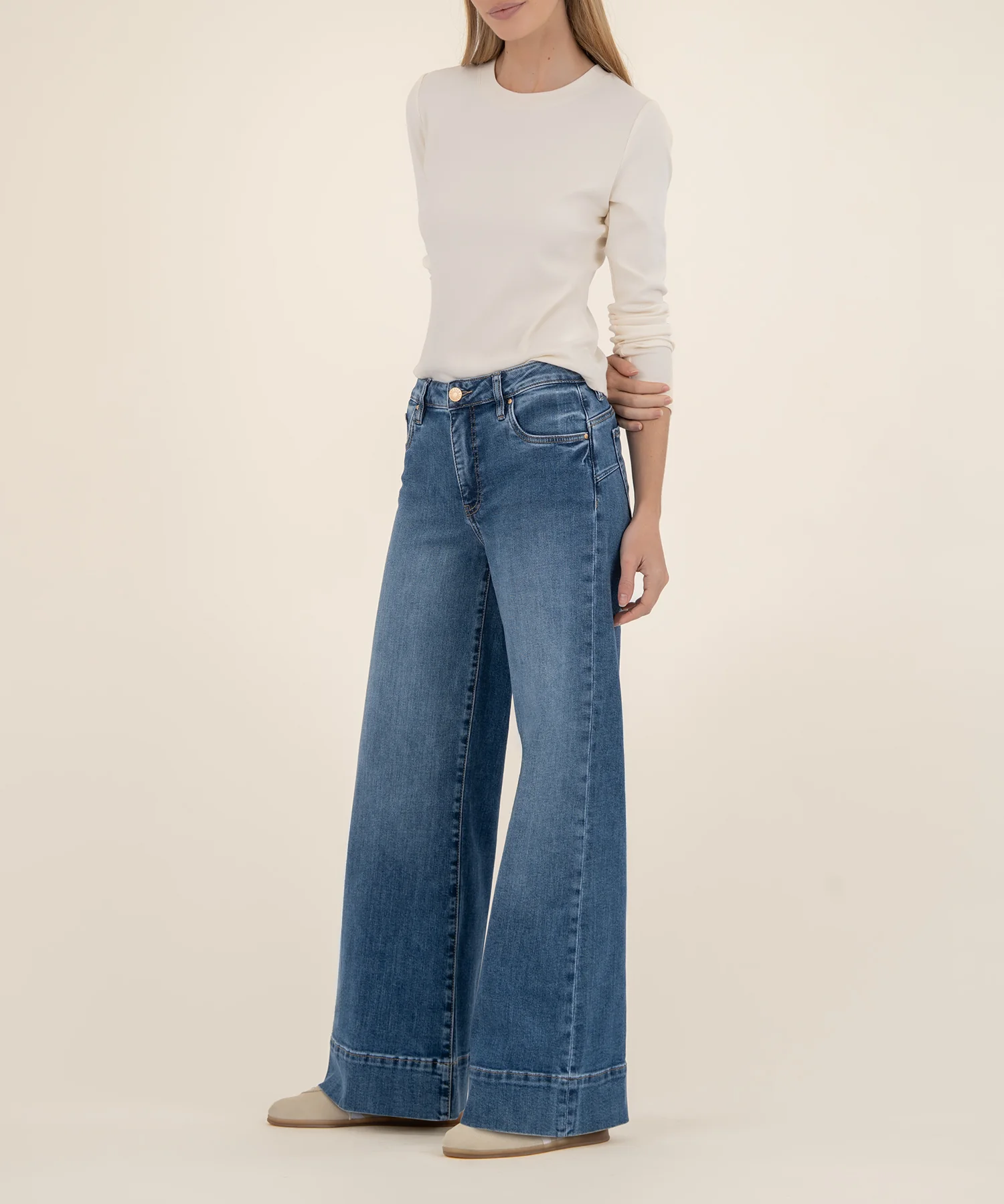 • These high-rise wide leg jeans strike the perfect balance between structure and comfort. Designed in a classic medium wash with a bold wide hem, they bring an effortlessly polished feel to any look.