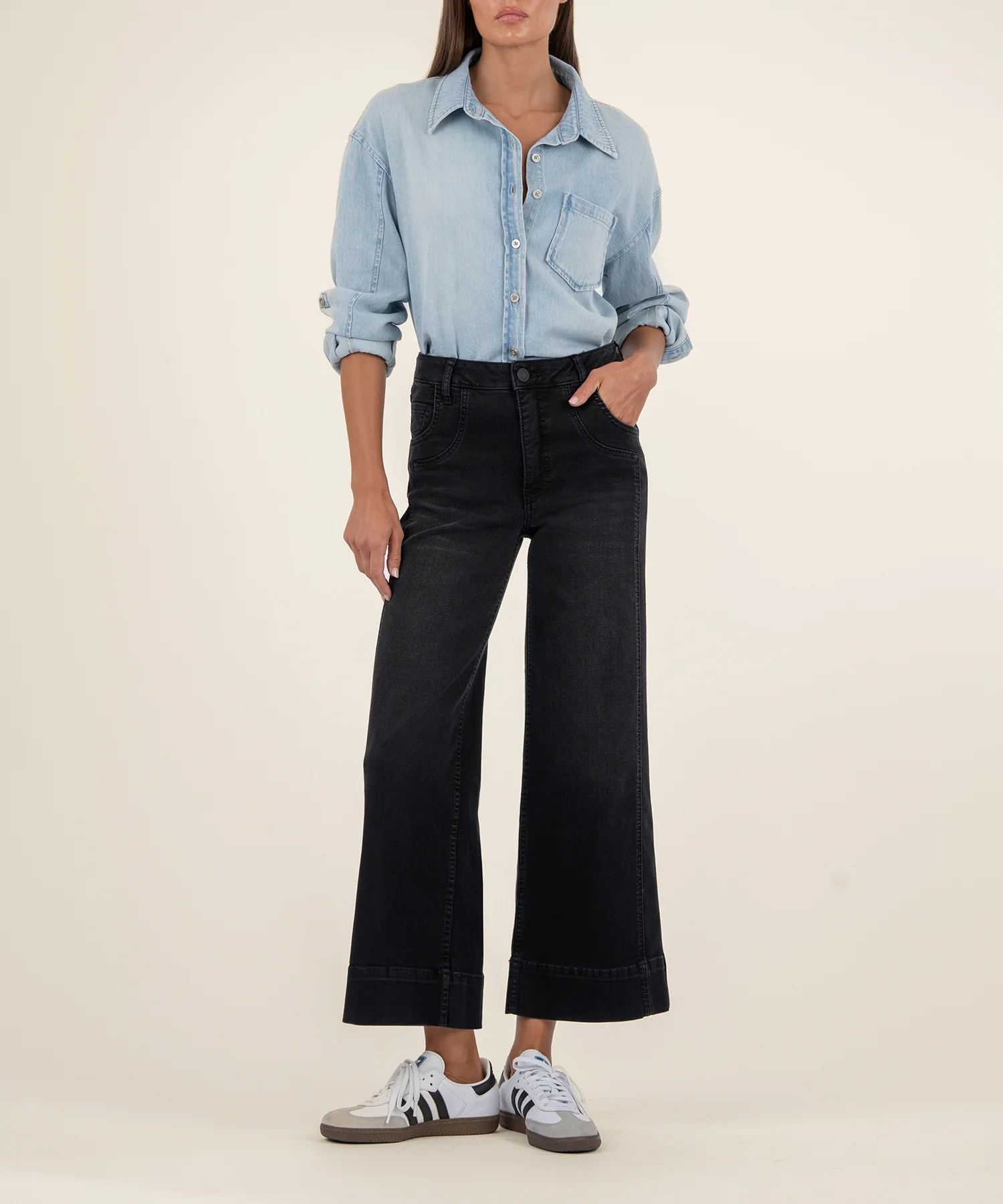Step up your style with these high-rise, wide-leg jeans in a sleek dark wash, finished with standout front patch pockets. Made from super stretchy material, they offer a comfortable fit that moves with you while keeping a structured, on-trend silhouette.
