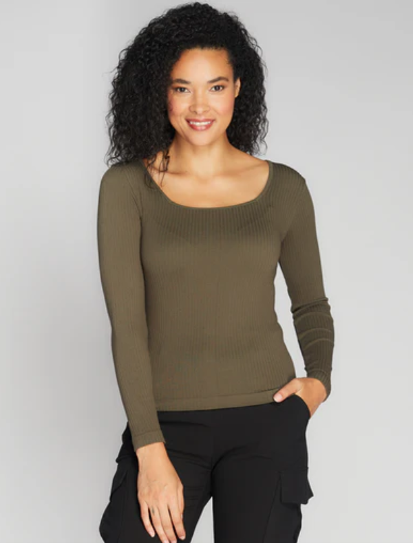 • This ribbed long sleeve features a flattering square neckline and a super-stretchy, one-size fit that contours comfortably to your shape. The soft, rib-knit fabric adds subtle texture while keeping things sleek and easy to style.