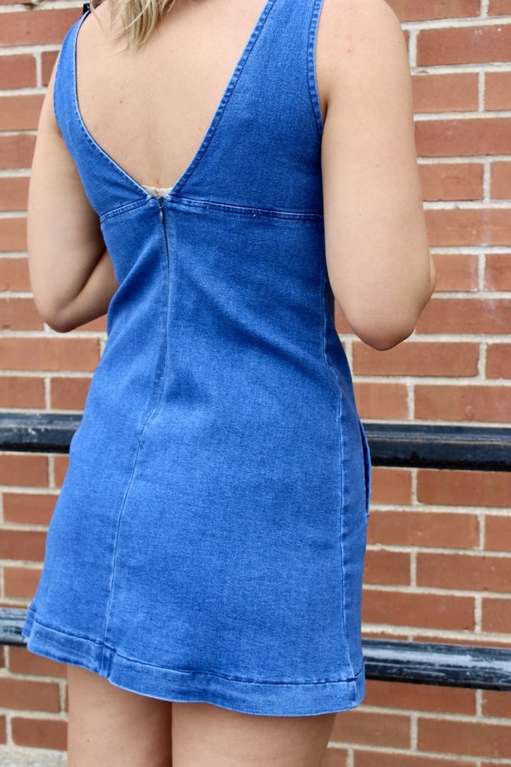 Your new go-to denim dress just landed. Designed with a flattering deep V neckline and a sleek, body-skimming silhouette, this mini dress is equal parts easy and elevated.