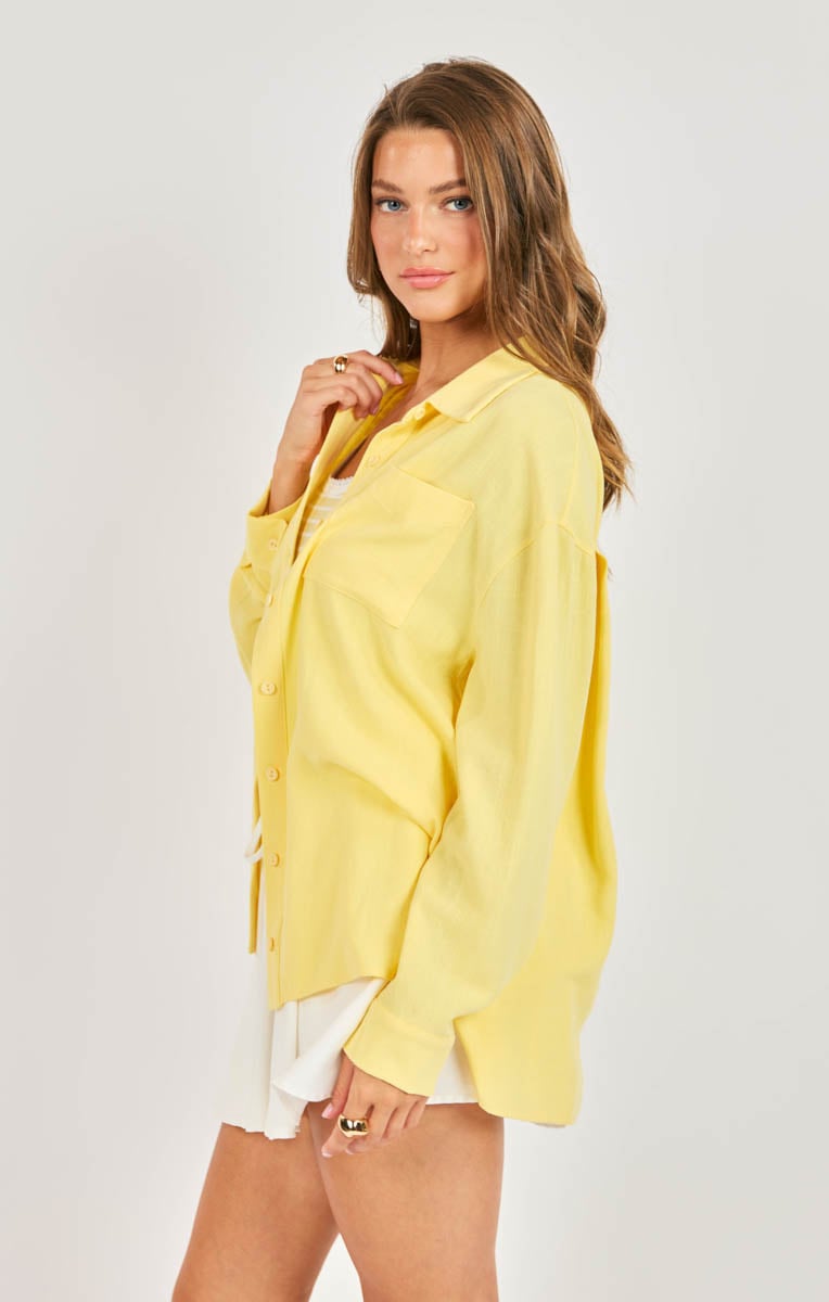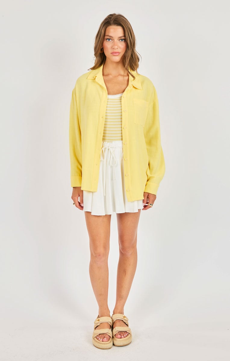 Add a pop of sunshine to your wardrobe with this easy, lightweight button-up. Designed for effortless layering, it pairs perfectly with tanks, shorts, or skirts for that relaxed summer feel.